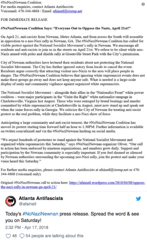 The Atlanta Antifascists also planned a counter protest in reply to the NSM rally. The Atlanta group was working to spread the word to all the same minded groups to show up in force to oppose the Neo Nazi group, NSM. This news of the counter protesters put the city of Newnan more on edge, because of the attention that was being brought onto the rally. In a joint effort with local and state police Newnan heightened security in anticipation of the counter protesters presence.